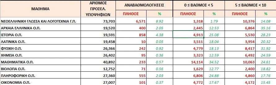 Στην Ιστορία το 53,31% έγραψε κάτω από 10 (10.443 υποψήφιοι) και στα Αρχαία Ελληνικά οι υποψήφιοι που δεν έπιασαν τη βάση ανέρχονται σε 9.309 (47,69%).