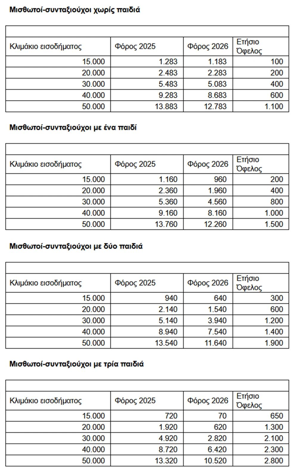 Τα ποσά αφορούν ετήσιο όφελος από τη μείωση της παρακράτησης και θα αποτυπώνονται μήνα-μήνα στη μισθοδοσία/σύνταξη από τον Ιανουάριο.