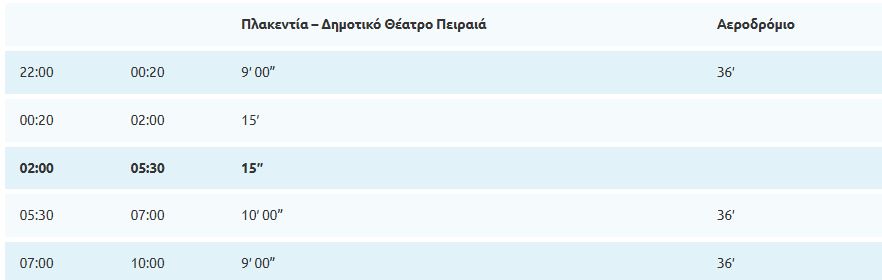 Γραμμή 3 (Νίκαια – Αεροδρόμιο): Δρομολόγια ανά τακτά διαστήματα από 22:00 έως 10:00.