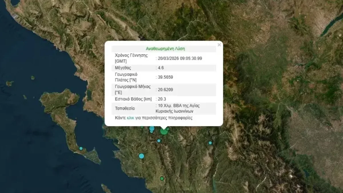 Στις 20 Μαρτίου 2026, το πρωί σημειώθηκε σεισμός 4,6 Ρίχτερ στα Ιωάννινα, προκαλώντας ανησυχία στην περιοχή. Σύμφωνα με το Γεωδυναμικό Ινστιτούτο της Αθήνας, το επίκεντρο του σεισμού εντοπίστηκε 10 χιλιόμετρα βόρεια-βορειοανατολικά της Αγίας Κυριακής Ιωαννίνων. Η σεισμική δόνηση είχε εκτιμώμενο εστιακό βάθος 20.3 χιλιομέτρων, γεγονός που την καθιστά έναν από τους πιο αισθητούς σεισμούς της τελευταίας περιόδου στην περιοχή.