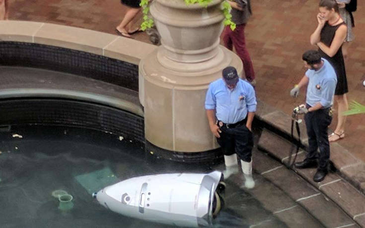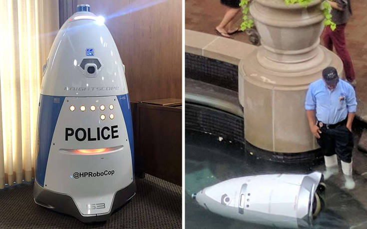 Ποιο έγκλημα; Να σταματήσει έναν μεθυσμένο, που κατάφερε να ρίξει το ρομπότ των 135 κιλών μέσα στο σιντριβάνι…