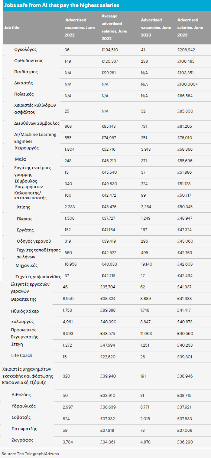 Tις καλύτερα αμειβόμενες θέσεις εργασίας που κινδυνεύουν λιγότερο από την τεχνητή νοημοσύνη κατέγραψε η ειδική πλατφόρμα εύρεσης εργασίας Jobsite Adzuna βάσει ερευνών που έχει διεξαγάγει το OpenAI και το Πανεπιστήμιο της Πενσυλβάνια.