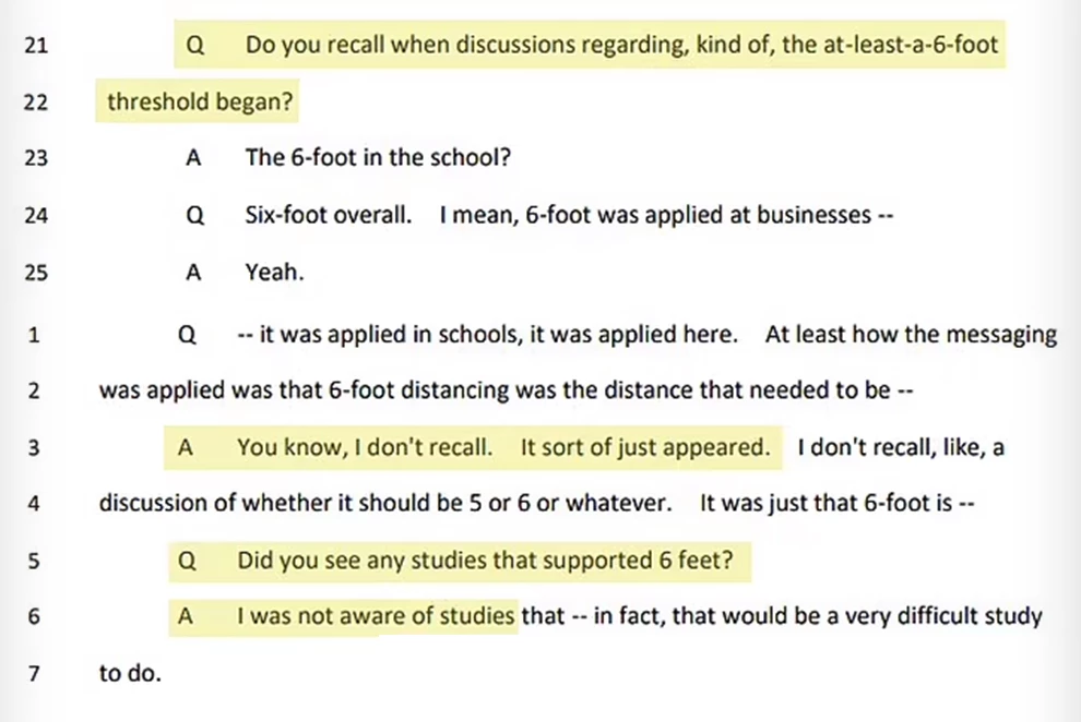 «Δεν θυμάμαι. Απλώς εμφανίστηκε», είπε σύμφωνα με όσα γράφουν τα πρακτικά που είδαν το φως της δημοσιότητας και πρόσθεσε πως «δεν γνώριζε συγκεκριμένες μελέτες» που να υποστηρίζουν ότι η απόσταση μειώνει τον κίνδυνο μετάδοσης του ιού. Παράλληλα, τόνισε πως όσες μελέτες έγιναν εκείνη την περίοδο, έδειχναν αντικρουόμενα στοιχεία, δηλαδή ορισμένες υποστήριζαν το μέτρο της κοινωνικής απόστασης και άλλες όχι.