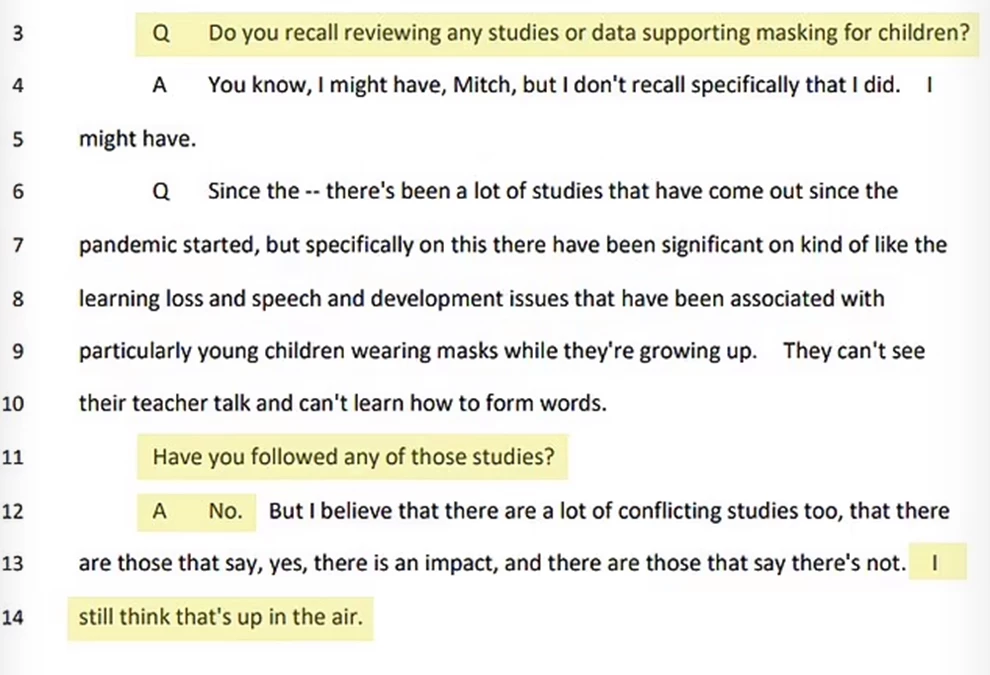«Θυμάστε να έχετε δει οποιεσδήποτε μελέτες ή δεδομένα που να υποστηρίζουν τη χρήση μάσκας στα παιδιά;», ρώτησαν στη συνέχεια τον Φάουτσι, με τον γιατρό να απαντάει: «Μπορεί να το έκανα. Αλλά δεν θυμάμαι συγκεκριμένα να το κάνω».