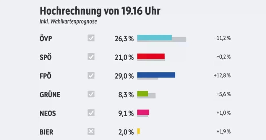 Οι προβλέψεις, που βασίζονται στα πρώτα αποτελέσματα, δίνουν στο κόμμα του Kickl ποσοστό 29% - τρεις μονάδες μπροστά από το συντηρητικό Λαϊκό Κόμμα με 26,3%, αλλά πολύ μακριά από την πλειοψηφία.