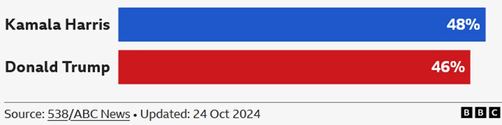 Η Χάρις είχε ένα μικρό προβάδισμα έναντι του Τραμπ στους μέσους όρους των εθνικών δημοσκοπήσεων από τότε που μπήκε στην κούρσα στα τέλη Ιουλίου και παραμένει μπροστά, όπως φαίνεται στο παρακάτω διάγραμμα με τα τελευταία στοιχεία στρογγυλοποιημένα προς τον πλησιέστερο ακέραιο αριθμό, όπως σημειώνει το BBC.