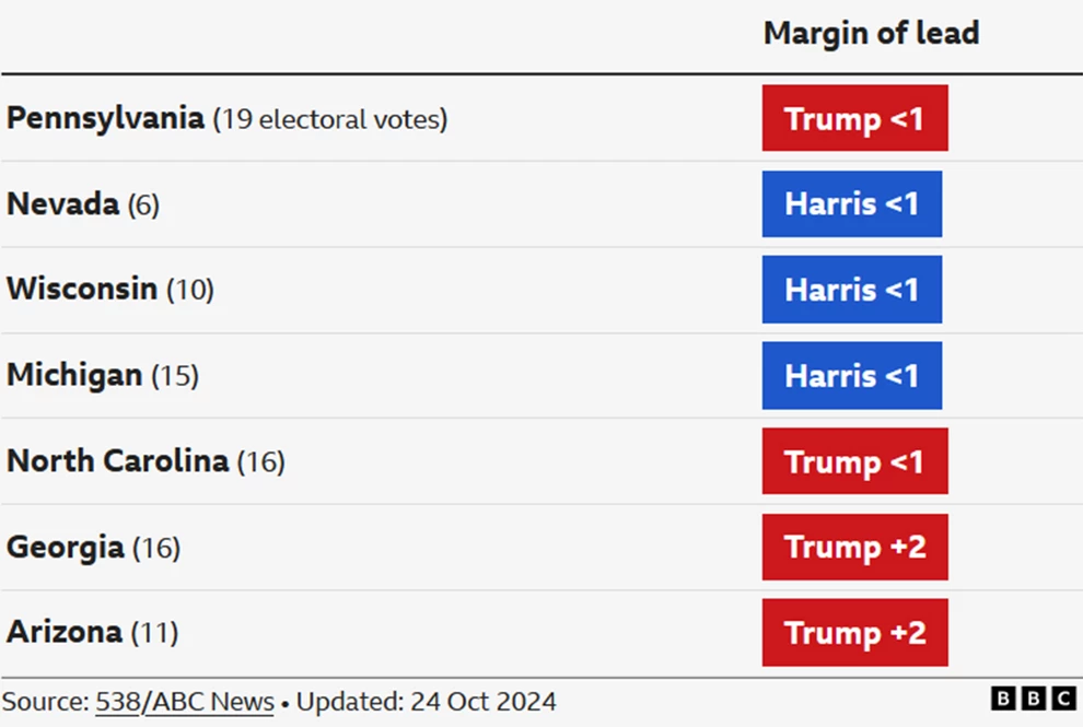 Αυτή τη στιγμή οι δημοσκοπήσεις δίνουν πολύ μικρή διαφορά στις επτά πολιτείες που θεωρούνται πεδία μάχης σε αυτές τις εκλογές και κανένας από τους υποψηφίους δεν έχει αποφασιστικό προβάδισμα σε καμία από αυτές, σύμφωνα με τους μέσους όρους των δημοσκοπήσεων.