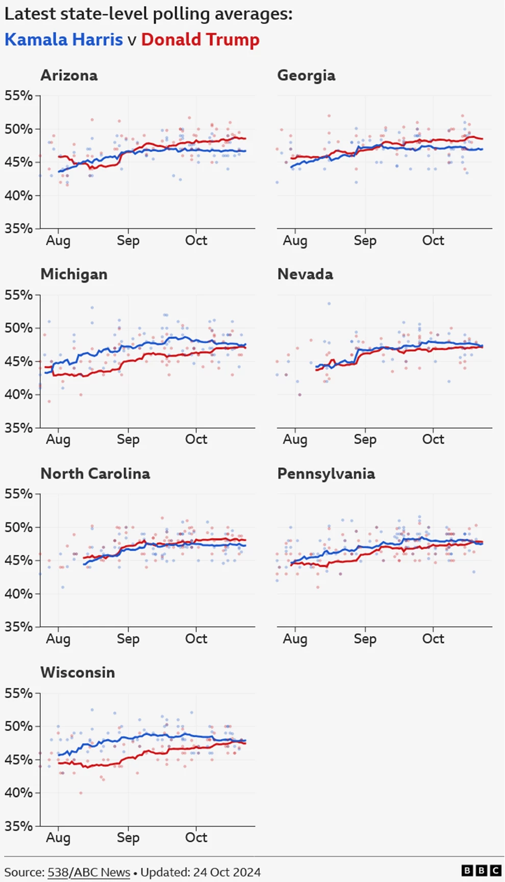 Στην Αριζόνα, την Τζόρτζια και τη Βόρεια Καρολίνα, το προβάδισμα έχει αλλάξει μερικές φορές από τις αρχές Αυγούστου, αλλά ο Τραμπ έχει ένα μικρό προβάδισμα εδώ και μερικές εβδομάδες. Παρόμοια είναι η ιστορία και στη Νεβάδα, αλλά με τη Χάρις να είναι η υποψήφια που προηγείται ελαφρώς.