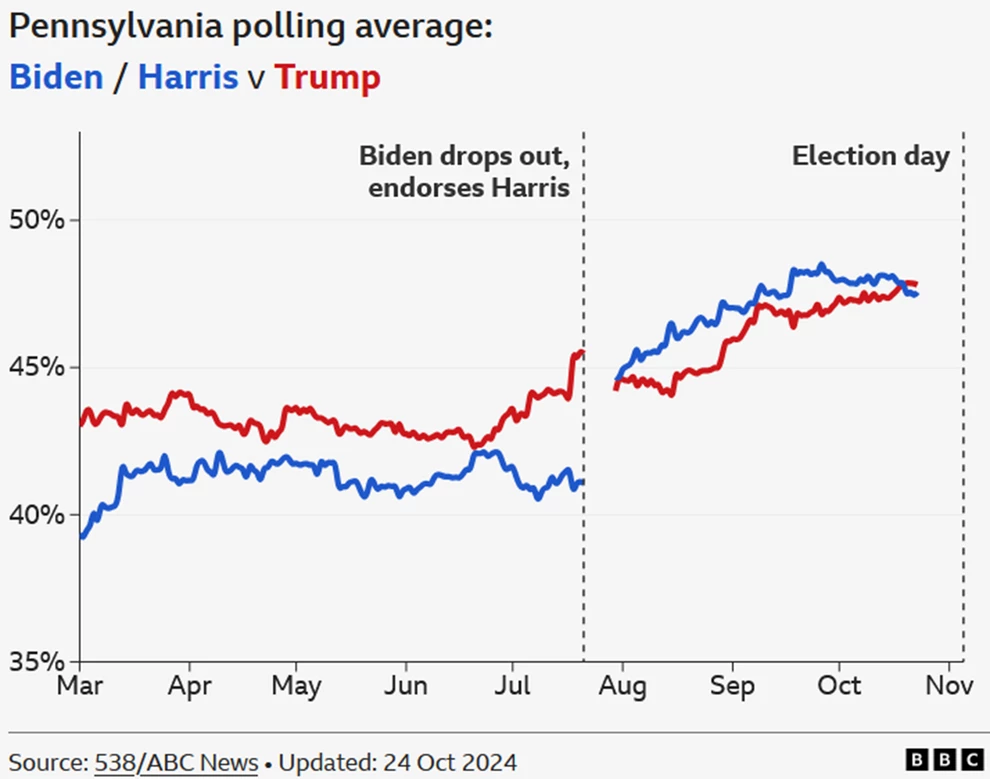 Στην Πενσιλβάνια, ο Μπάιντεν ήταν πίσω κατά σχεδόν 4,5 ποσοστιαίες μονάδες όταν εγκατέλειψε την κούρσα για την προεδρία, όπως δείχνει το παρακάτω διάγραμμα. Πρόκειται για μια πολιτεία-κλειδί και για τις δύο εκστρατείες, καθώς έχει τον μεγαλύτερο αριθμό εκλεκτόρων από τις επτά και επομένως η νίκη της διευκολύνει την επίτευξη των 270 ψήφων που απαιτούνται.