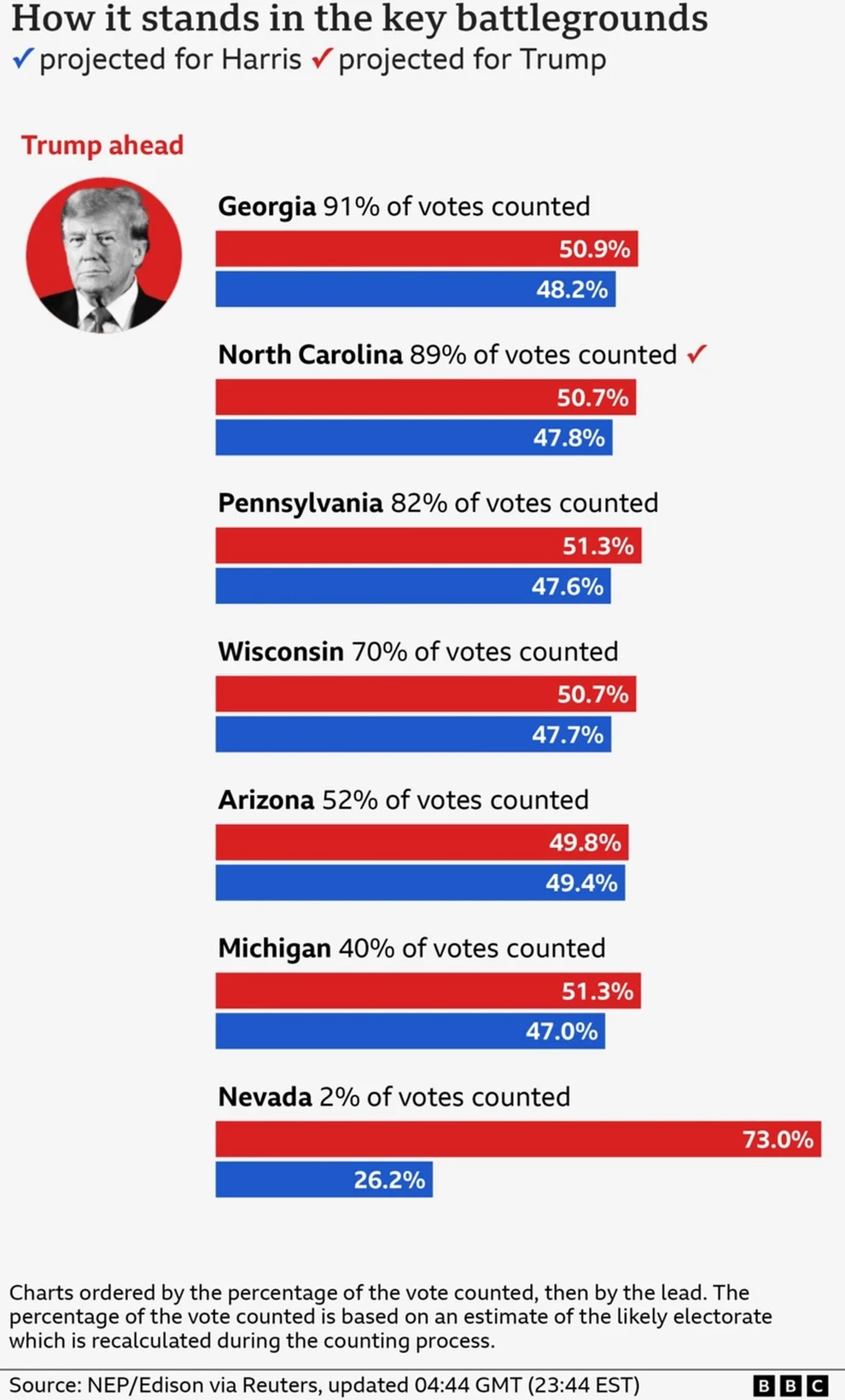 Το σασπένς ωστόσο συνεχιζόταν σε ουσιαστικά όλες τις «swing states», τις διεκδικούμενες πολιτείες που αναμενόταν να κρίνουν το αποτέλεσμα.