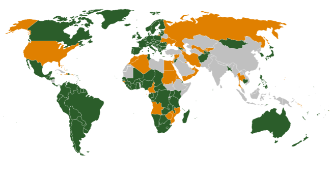 Στον παρακάτω χάρτη, με πράσινο χρώμα εμφανίζονται τα συμβαλλόμενα κράτη, χώρες δηλαδή που θα μπορούσε να συλληφθεί ο Νετανιάχου και ο Γκάλαντ, με πορτοκαλί τα κράτη που υπέγραψαν την ιδρυτική διακήρυξη αλλά δεν την επικύρωσαν τελικά και με γκρι τα κράτη που δεν συμμετείχαν εξαρχής στην ίδρυση του Διεθνούς Ποινικού Δικαστηρίου.