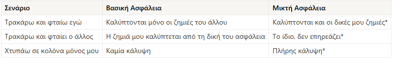 *Προσοχή! Στη μικτή ασφάλεια, αν έχεις απαλλαγή, πληρώνεις εσύ πρώτα ένα μέρος της ζημιάς, και μετά καλύπτει τα υπόλοιπα η ασφαλιστική. Αυτό επηρεάζει και την τιμή του ασφαλιστηρίου.