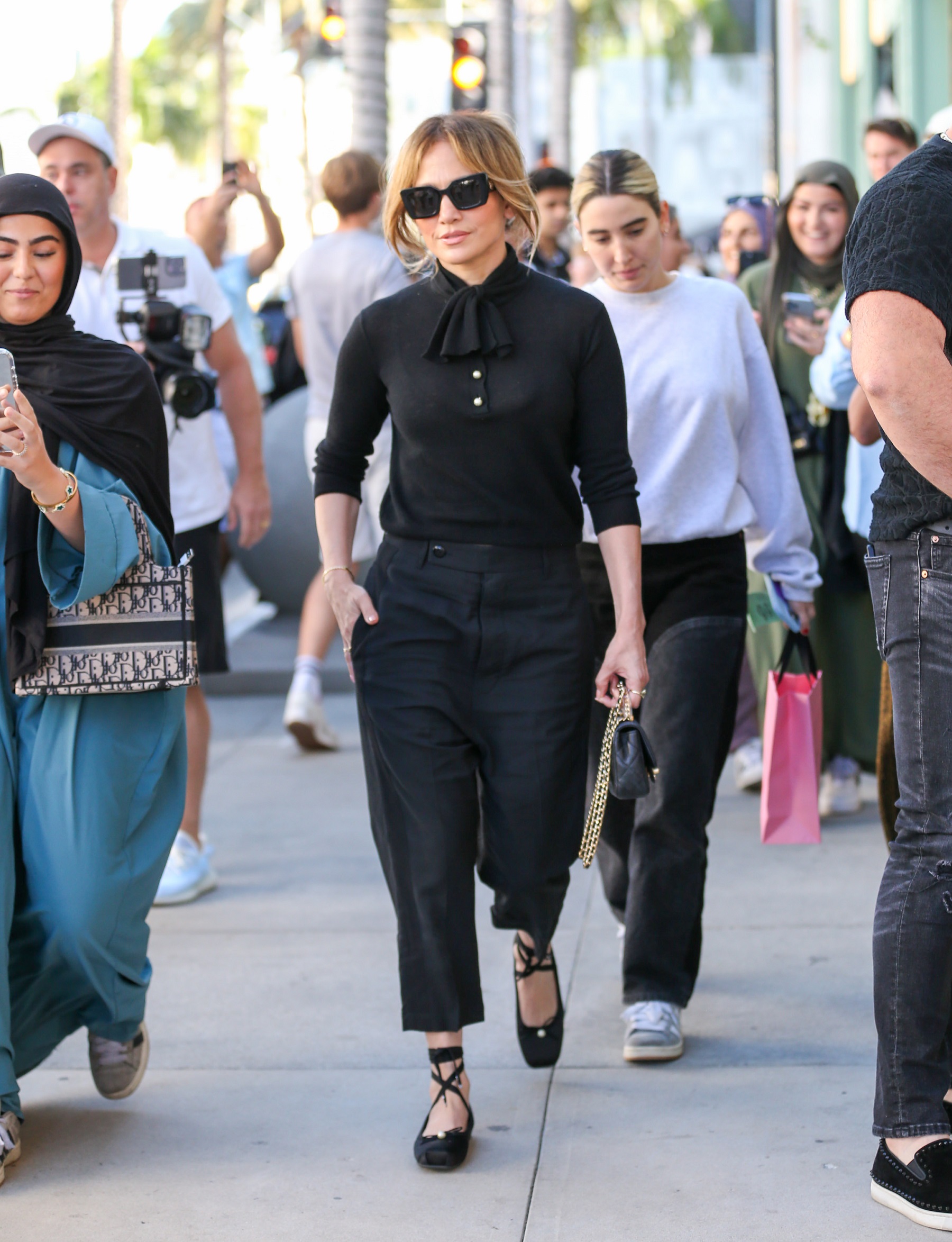 Η Jennifer Lopez έδειχνε πολύ κομψή σε μια εμφάνισή της στους δρόμους τους Λος Άντζελες εκμεταλλευόμενη τον καλό καιρό της εποχής στην πόλη. Η καλλιτέχνις έκανε μια total black εμφάνιση η οποία περιλάμβανε ένα tailored κάπρι παντελόνι, ένα πλεκτό τοπ με φιόγκο στη λαιμόκοψη και μια μίνι Chanel τσάντα με λουράκι από χρυσή αλυσίδα. Πρόσθεσε ένα ζευγάρι μαύρα γυαλιά ηλίου που ταίριαζαν τέλεια με τις curtain bangs στα μαλλιά της τα οποία ήταν μαζεμένα σε ένα χαλαρό updo.