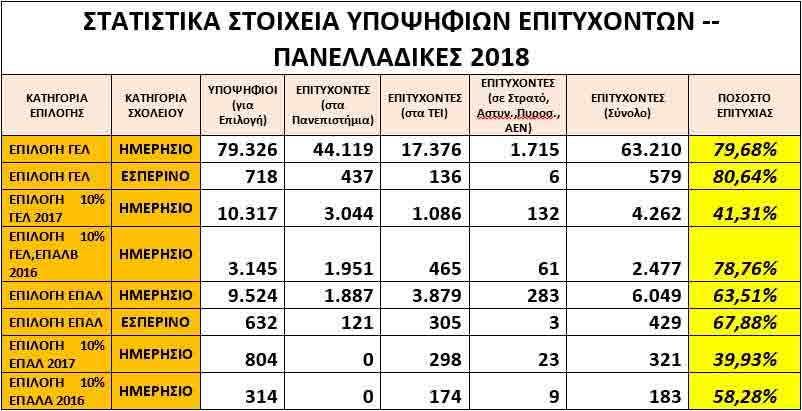 Αναλυτικά, από τους υποψηφίους των ΓΕΛ (ημερήσια και εσπερινά) σχεδόν οκτώ στους δέκα πέτυχαν να εισαχθούν σε κάποια σχολή της Τριτοβάθμιας Εκπαίδευσης (από τους 80.044 πέτυχαν οι 63.789, ποσοστό 79,69%). Από τα ΕΠΑΛ (ημερήσια και εσπερινά), από τους 10.156 υποψηφίους πέτυχαν οι 6.478, ποσοστό της τάξεως του 63,78%.