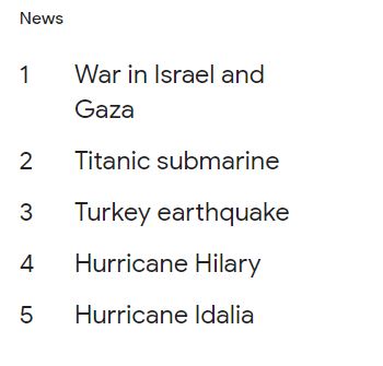Ο πόλεμος ανάμεσα σε Ισραήλ και Χαμάς βρέθηκε στην κορυφή των ειδησεογραφικών αναζητήσεων της Google για το 2023 και ακολούθησαν η τραγωδία του υποβρυχίου Titan κοντά στο ναυάγιο του Τιτανικού και οι φονικοί σεισμοί στην Τουρκία. Το Top5 κλείνει με τους τυφώνες Hilary και Idalia.