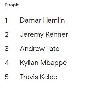 Ο Damar Hamlin ήταν το πρόσωπο με τις περισσότερες αναζητήσεις στη Google φέτος. Ο αμυντικός των Bufalo Bills υπέστη καρδιακή ανακοπή κατά τη διάρκεια ενός αγώνα NFL τον Ιανουάριο. Στη 2η θέση ήταν ο ηθοποιός Jeremy Renner, ο οποίος επέζησε από το πολύ σοβαρό ατύχημα που είχε με εκχιονιστικό μηχάνημα την πρωτοχρονιά του 2023. Ακολούθησαν ο Andrew Tate, o Κιλιάν Μπαπέ και ο Travis Kelce.