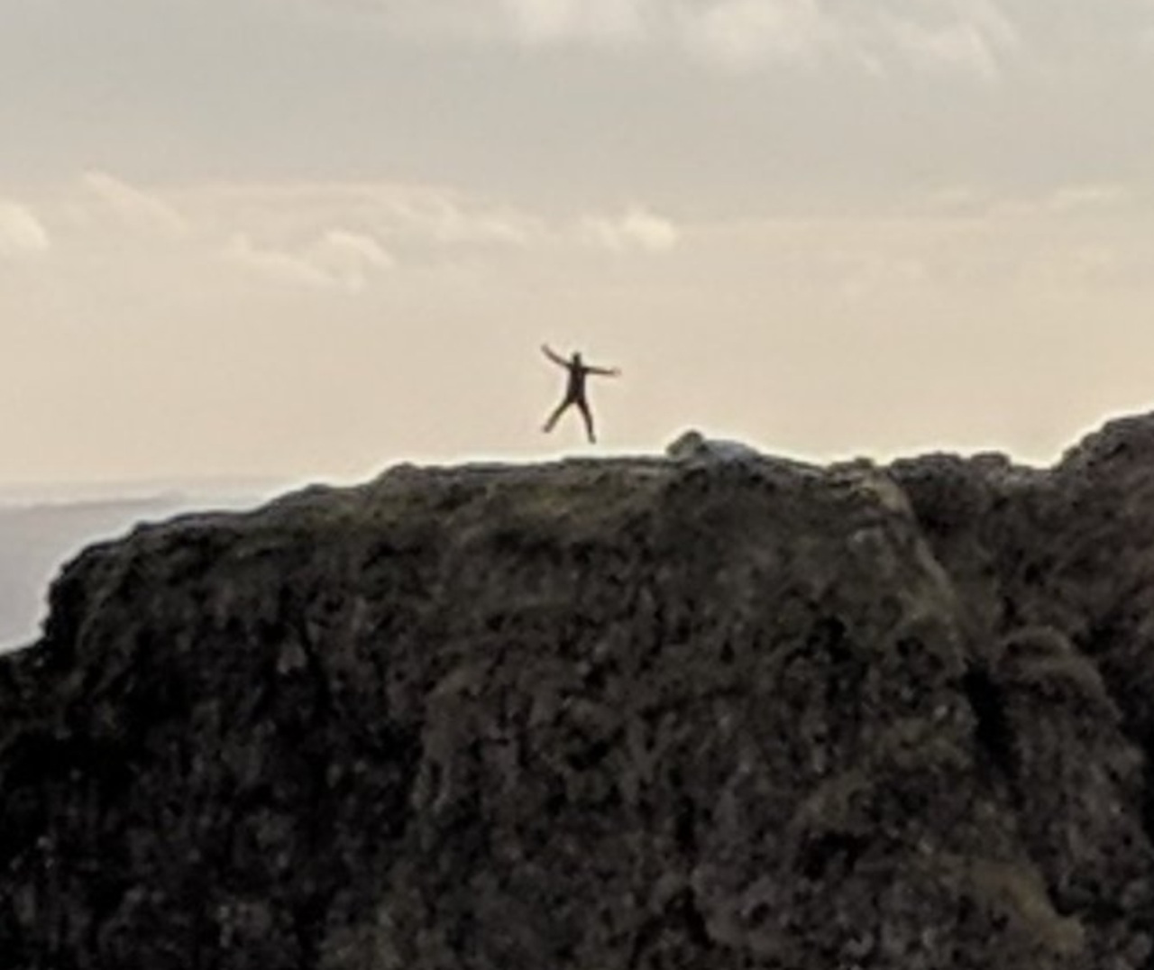 Όμως, κάνοντας μεγέθυνση, φαίνεται μια ανθρώπινη φιγούρα κοντά στην άκρη του βράχου – και μάλιστα, μοιάζει να κάνει άλμα στον αέρα, σαν να χορεύει κάτω από τον ουρανό.